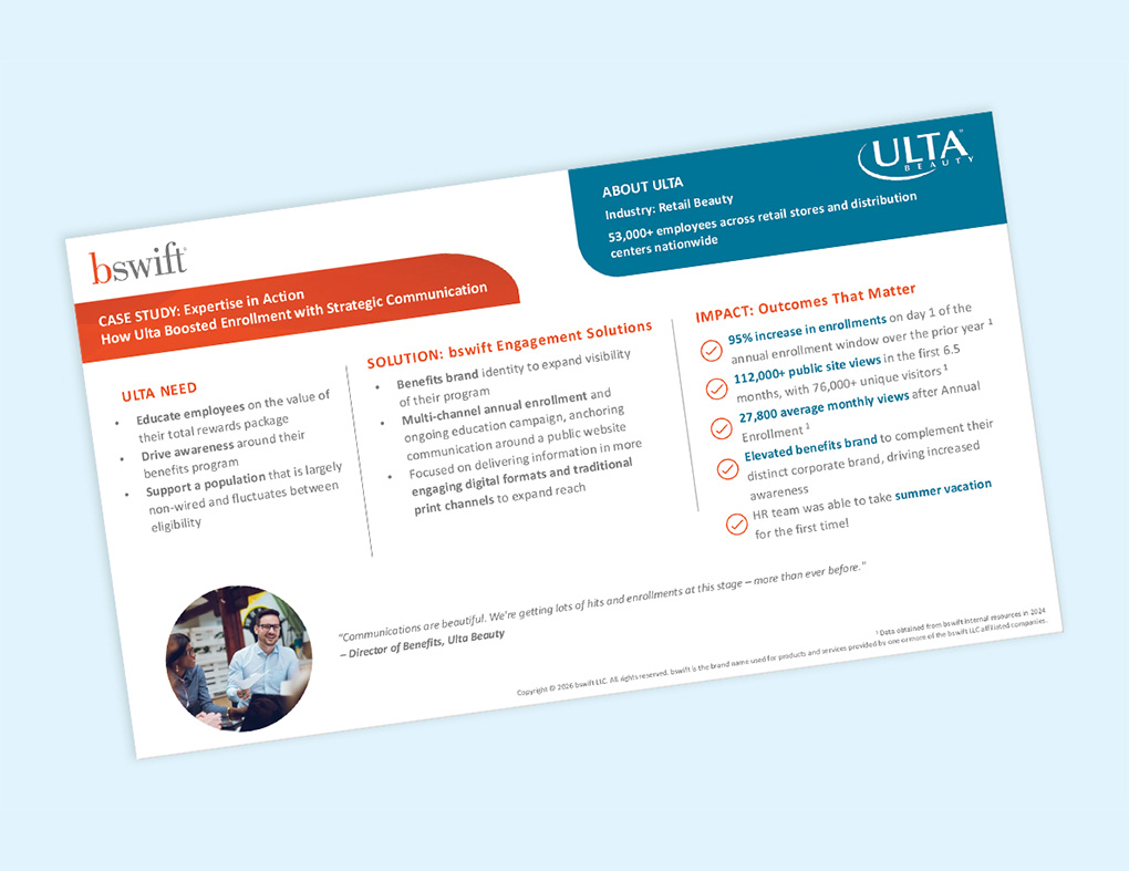 Hear how bswift’s responsive partnership and intuitive solutions simplify enrollment, payroll, and data management while delivering exceptional support and empowering HR.