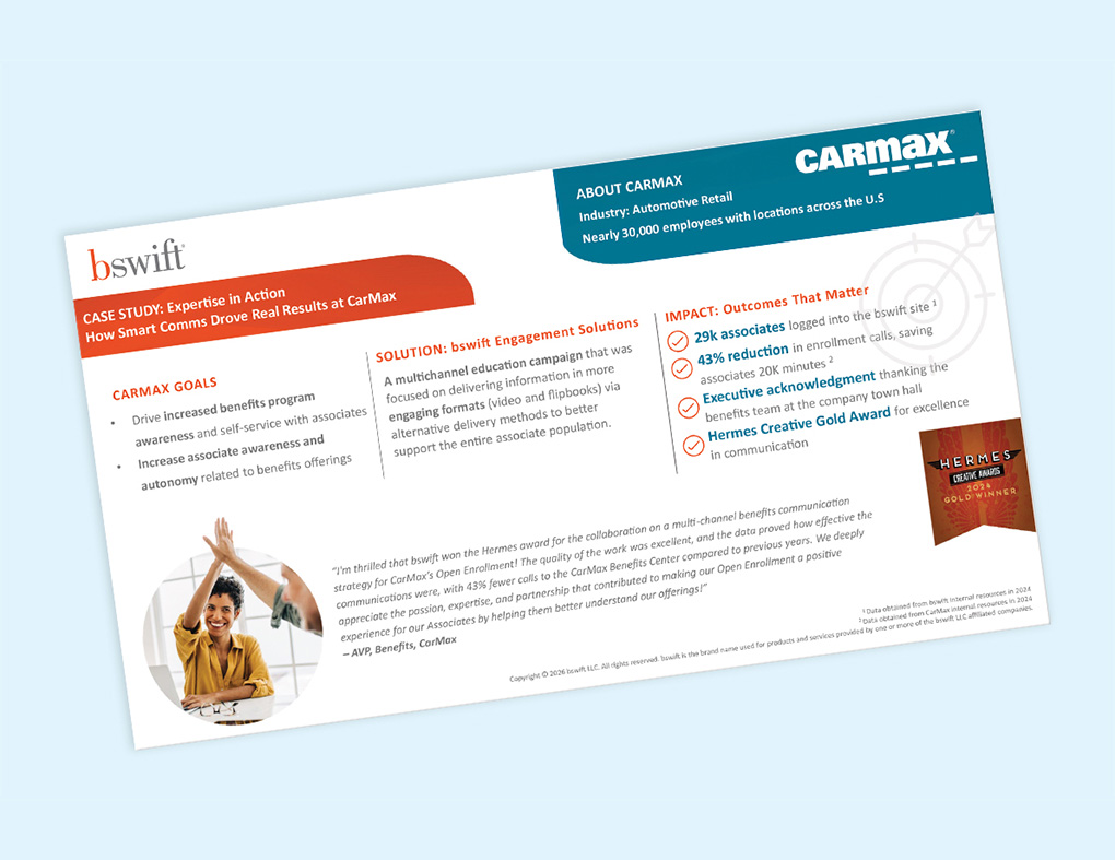 Through a tailored, multi-channel benefits strategy, bswift helped CarMax simplify complex benefits communication, drive associate action, and elevate the overall enrollment experience.